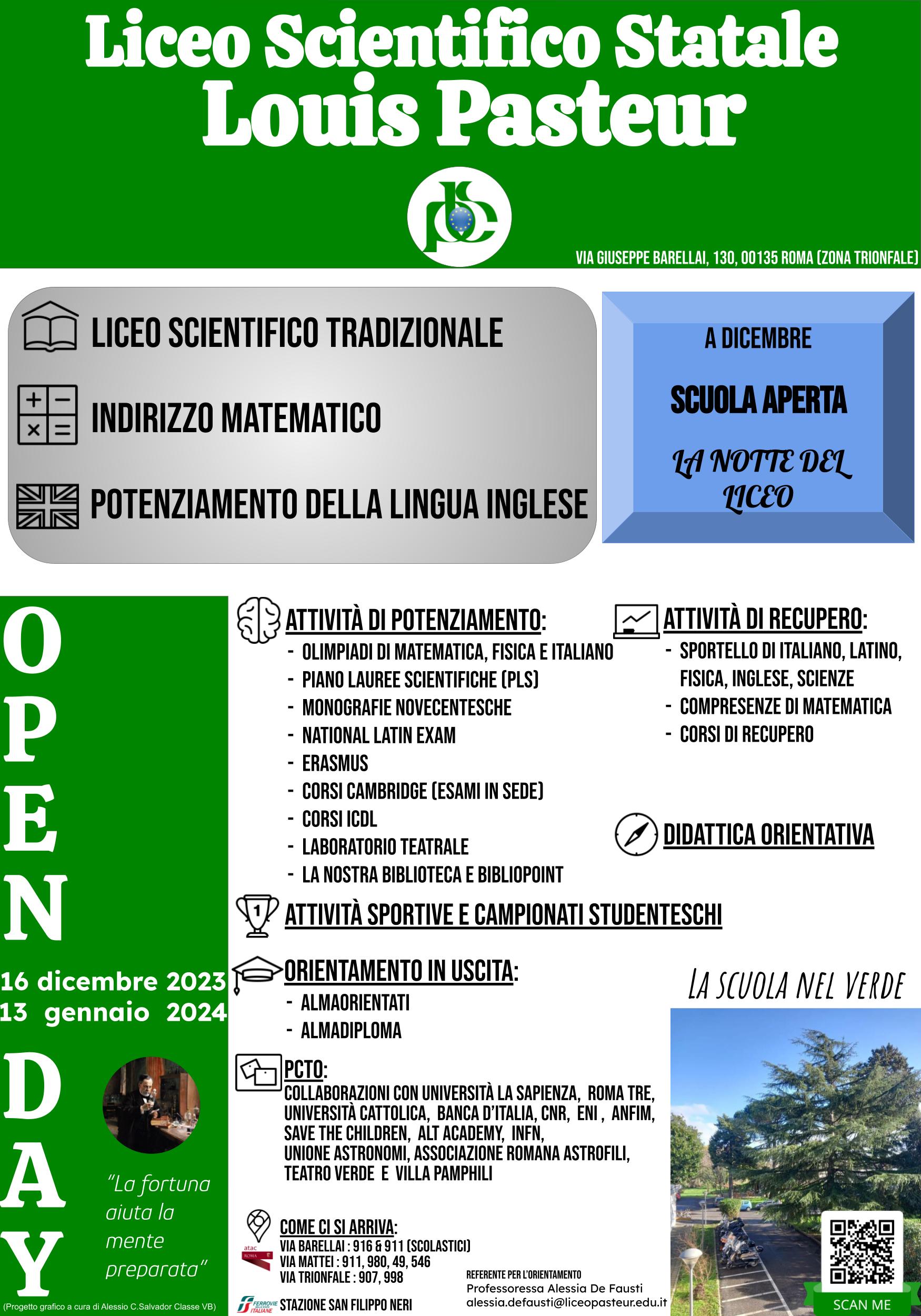Per ulteriori informazioni, è possibile comunicare via email con la prof.ssa Alessia De Fausti, referente per l’orientamento, utilizzando l’indirizzo opendaypasteur@liceopasteur.edu.it.